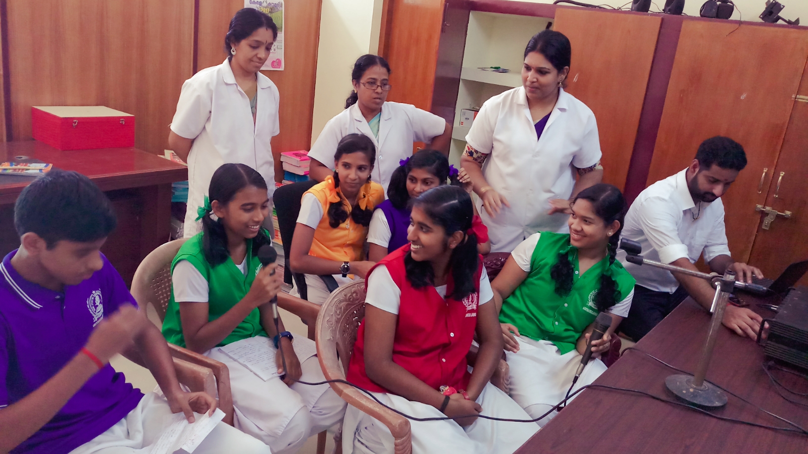 The students have been controlling the school radio sound for past three months. They are presenting approximately 5 segments, including local and global news, top three songs of the week and tips.
